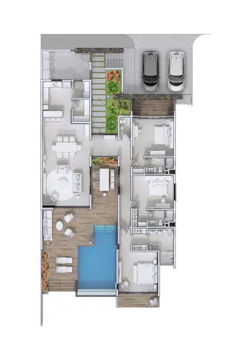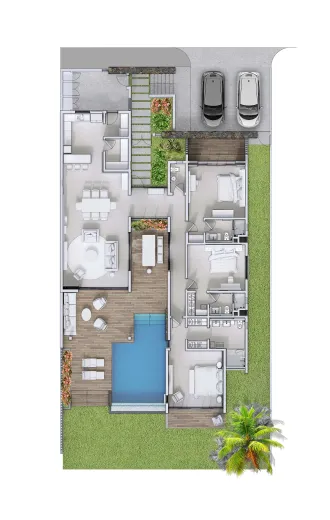 These houses are an ode to the gentle Mauritian lifestyle and offer complete wellbeing. Their living spaces are congenially arranged around a patio, an outdoor space in which to relax while luxuriating in the soft rays of the sun. To one side of the patio, three bedrooms with adjoining bathrooms place the emphasis on comfort. In the wing opposite, the houses’ living areas are generous and welcoming. Their well-designed kitchens, attractive dining rooms and large living rooms together provide the basis for an ideal quality of life.
