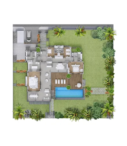 Les Hauts d'Anbalaba also includes six plots of unbuilt land of 1,900 to 2,700 m². These are located at the highest point of the Anbalaba site and offer extraordinary views over the azure expanse of the ocean. With architect-drafted building guidelines that chime perfectly with the aesthetic of Les Hauts d'Anbalaba, these plots offer buyers an opportunity to build unique villas of the highest standing, designed either by ERIC CHAVOIX, Anbalaba’s architects, or by an architect of their choice.