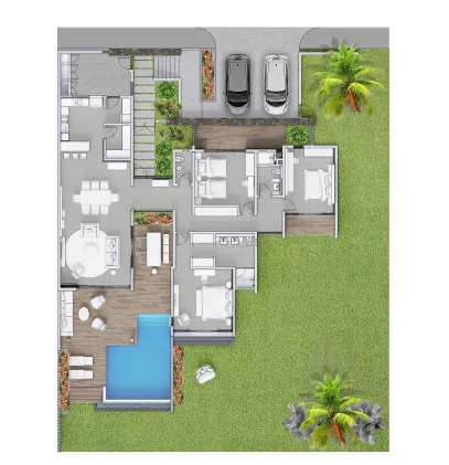 Ces maisons à l’élégance tropicale s’articulent autour d’un agréable patio baigné de lumière, et sont prolongées par une belle terrasse accueillant une piscine en mosaïques bleutées où se rafraîchir tout au long de la journée. Leurs pièces de vie conviviales comprenant une cuisine fonctionnelle, un séjour accueillant et une belle salle à manger se déclinent d’un côté du patio, tandis que de l’autre, trois chambres, dont une suite parentale, viennent parfaire le confort qu’elles proposent. A noter que deux de ces chambres partagent une même salle de bains, pour une originalité plus affirmée.