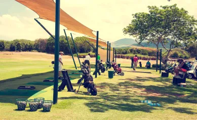Le parcours est ponctué d'obstacles d’eau et bordé de cocotiers. Les joueurs apprécient aussi le Clubhouse qui les accueille après chaque session !