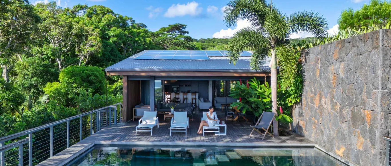 Ces villas Pomelo offrent une vue dégagée sur le lagon, et une proximité avec la vie du villa d’Anbalaba. A l’intérieur, l’espace s’organise de façon à privilégier le confort et le bien-être des habitants au quotidien. Si la cuisine et l’agréable salle à manger sont contiguës pour mieux faire l’éloge de la convivialité, le salon s’ouvre quant à lui sur une belle terrasse prolongée par une sublime piscine aux teintes bleutées, qui font écho à la couleur du ciel et de l’océan. La vue depuis ce point d’eau contraste par sa verdure. La piscine laisse en effet place à un jardin ponctué de plantes endémiques rares de l’Ile Maurice, où le regard peut se perdre en toute sérénité. Enfin, sur le côté, les 3 chambres, dont une suite parentale équipée d’une salle de bains, donnent-elles aussi sur le jardin, pour privilégier une quiétude absolue – et ont toute une douche extérieure.