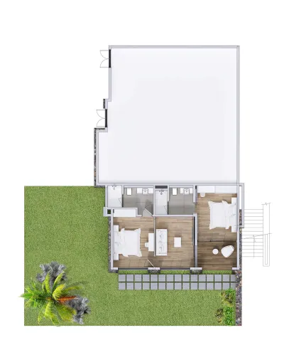 En rez-de-jardin, sous la varangue et le salon, trois pièces accessibles de l’extérieur offrent un espace de vie supplémentaire totalement indépendant. Aménagé en deux chambres et un espace bureau ou télévision, il vient parachever le confort exclusif offert par ces luxueuses villas de prestige.